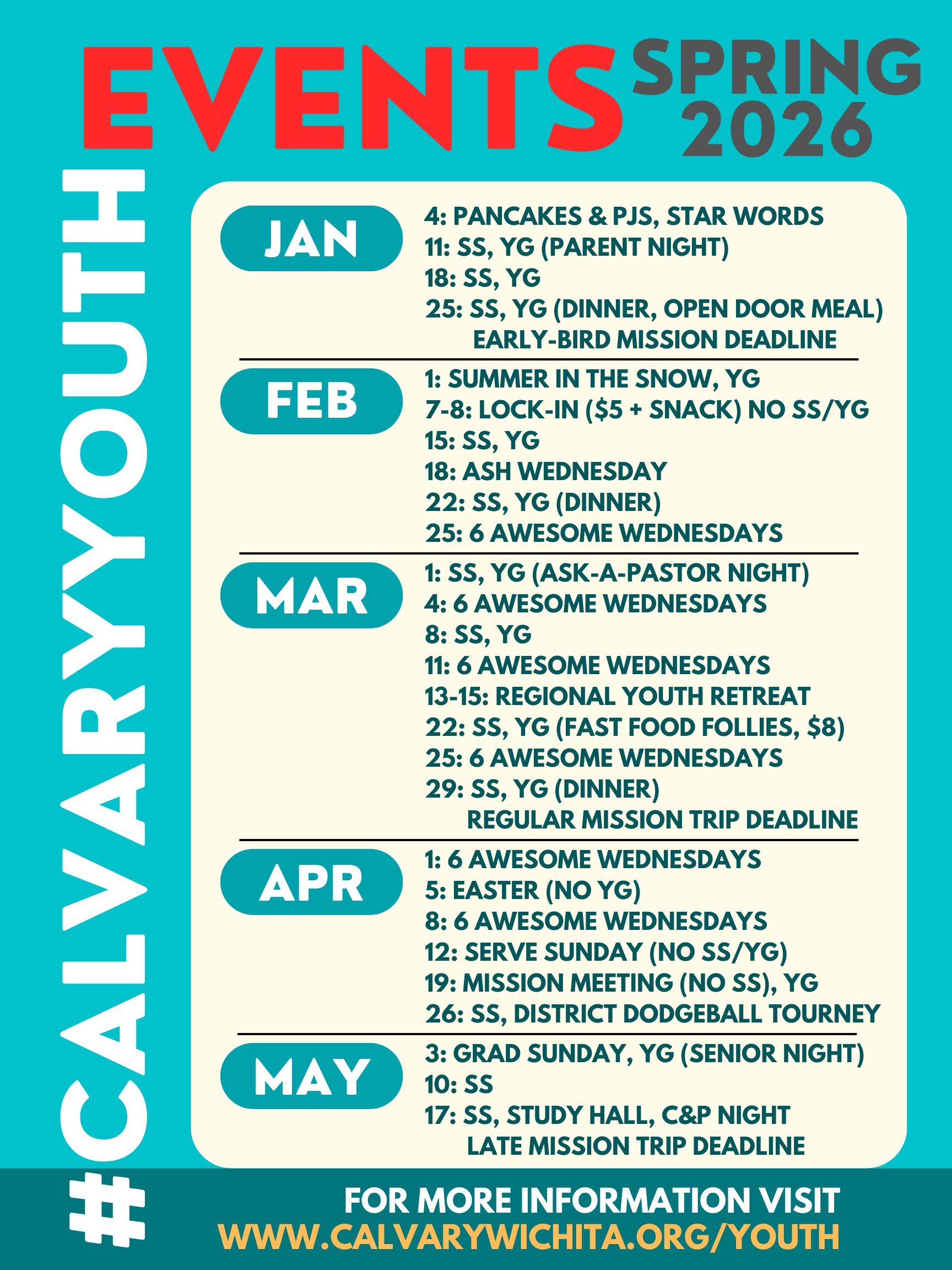 Calvary Youth meet three times a week: Sunday morning for Sunday School, Sunday afternoon for Youth Group, and new for Fall 2025: 6 Awesome Wednesdays, beginning Sept 24.